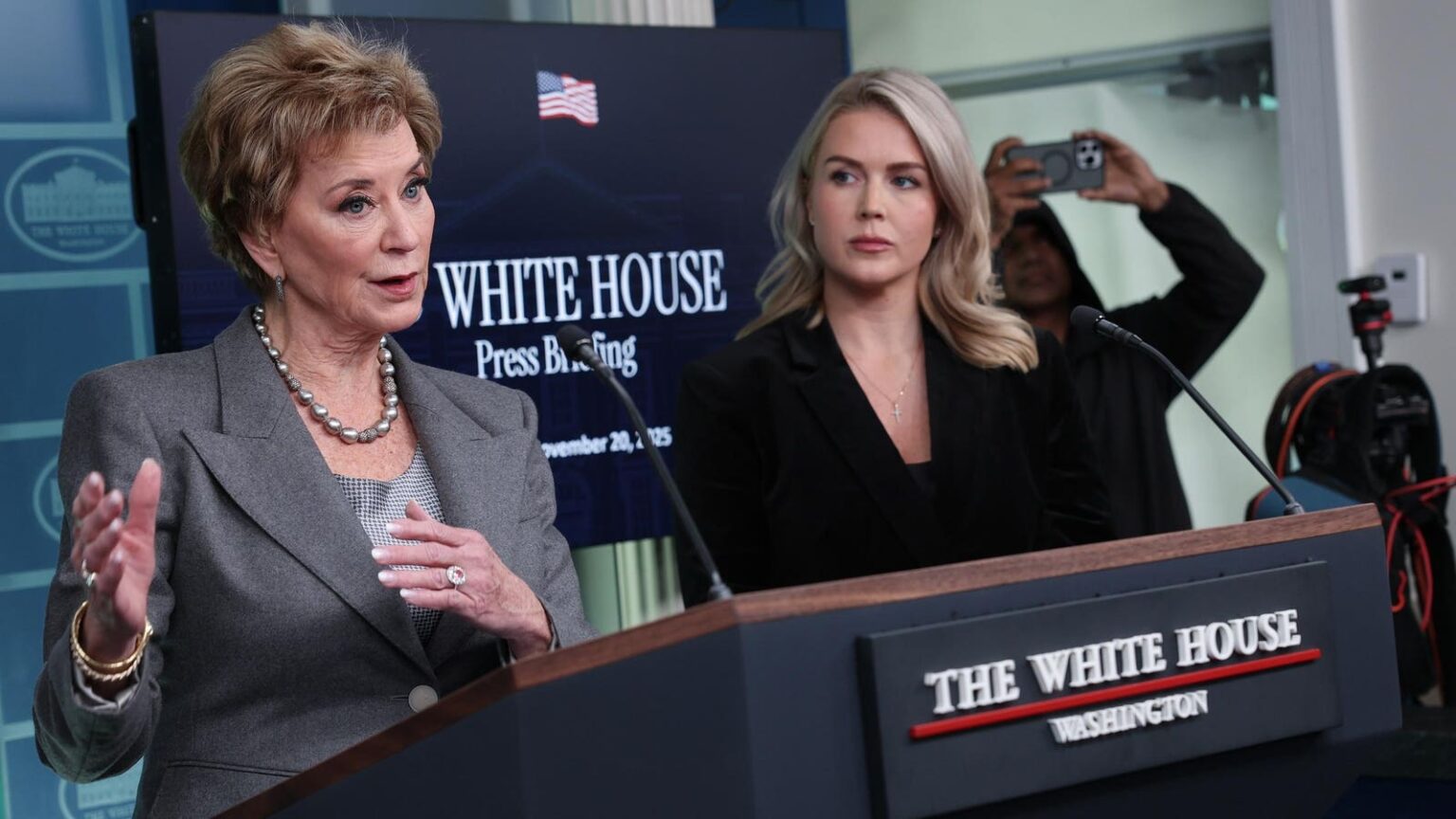 WASHINGTON, DC – NOVEMBER 20: Secretary of Education Linda McMahon (L) speaks during a White House press briefing with White House Press Secretary Karoline Leavitt (R) on November 20, 2025 in Washington, DC. McMahon addressed questions related to a recent initiative by the Trump administration to largely dismantle the Department of Education. The department is also moving forward to implement changes to student loans under the One Big, Beautiful Bill Act. (Photo by Win McNamee/Getty Images)