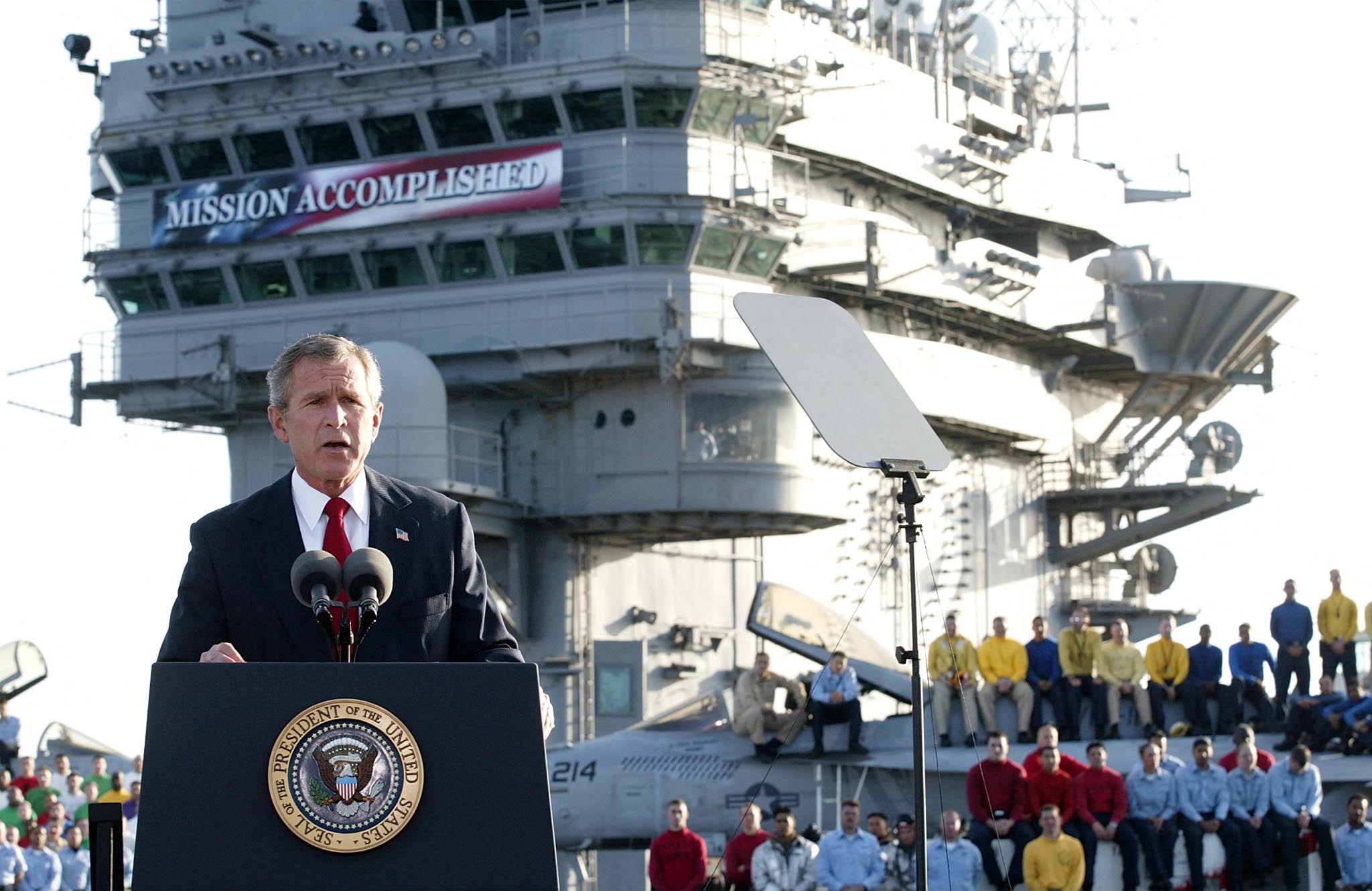 President George W. Bush addresses the nation aboard the nuclear aircraft carrier USS Abraham Lincoln on May 1, 2003, in front of a banner declaring “Mission Accomplished” after the invasion of Iraq. (STEPHEN JAFFE/AFP via Getty Images)