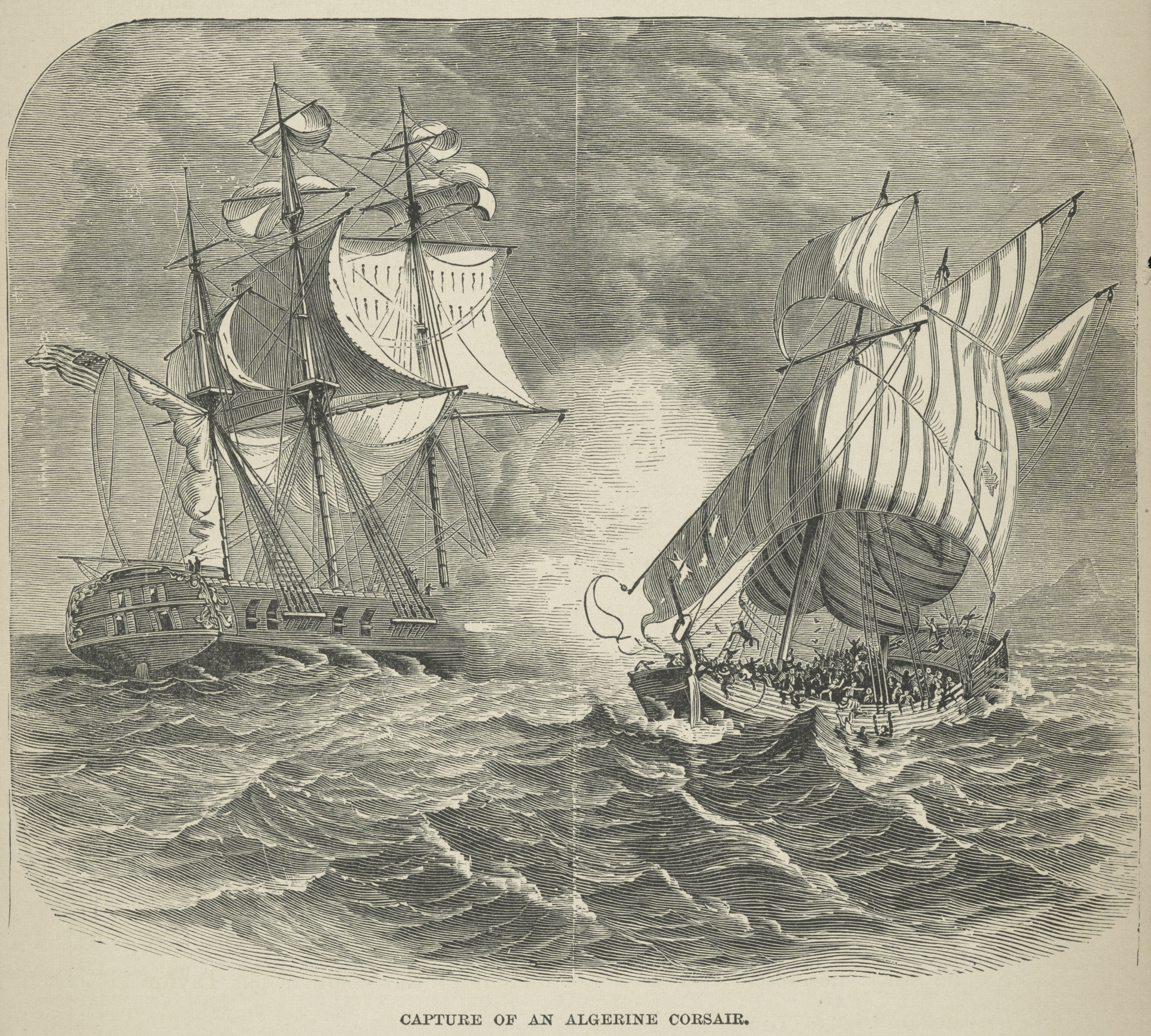 An engraving depicting an American naval vessel capturing an Algerian pirate ship during the First Barbary War, circa 1803. The original caption read “Capture of an Algerine Corsair.” (Photo by Kean Collection/Archive Photos/Getty Images)