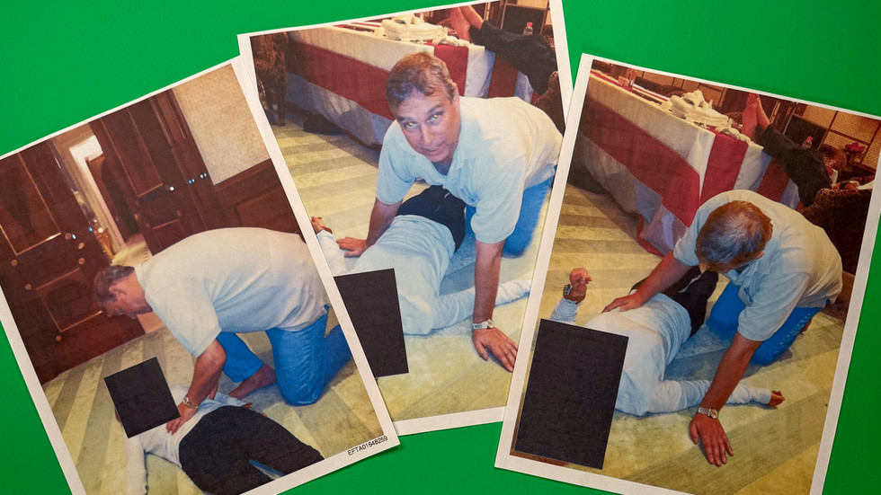 The images show the former royal kneeling over an unidentified woman lying on the floor, with no context provided as to when or where they were taken. The emails also feature Epstein proposing that Andrew have dinner with a “beautiful, trustworthy” 26-year-old Russian woman.