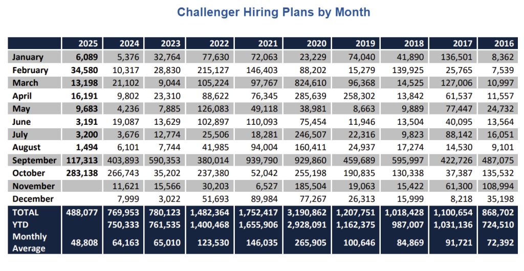 • “It’s possible with rate cuts and a strong showing in November, companies may make a late season push for employees, but at this point, we do not expect a strong seasonal hiring environment in 2025,” said Challenger.