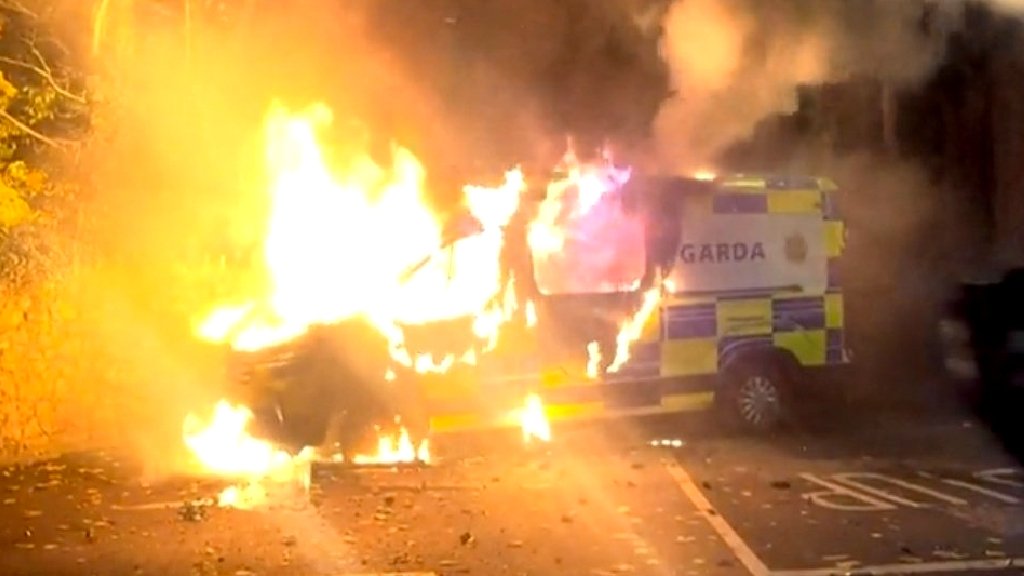 Garda (Irish Police) van on fire during protest against immigration in Dublin – screengrab social media X.