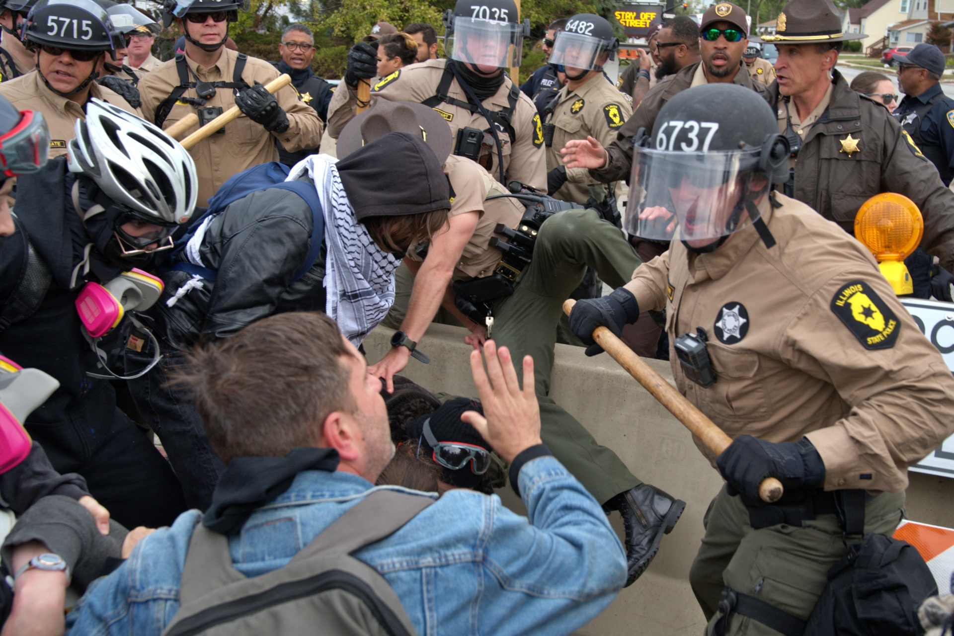 State Police clashes with demonstrators at an ICE facility in Broadview, Illinois, on October 10, 2025. (Jacek Boczarski/Anadolu via Getty Images)