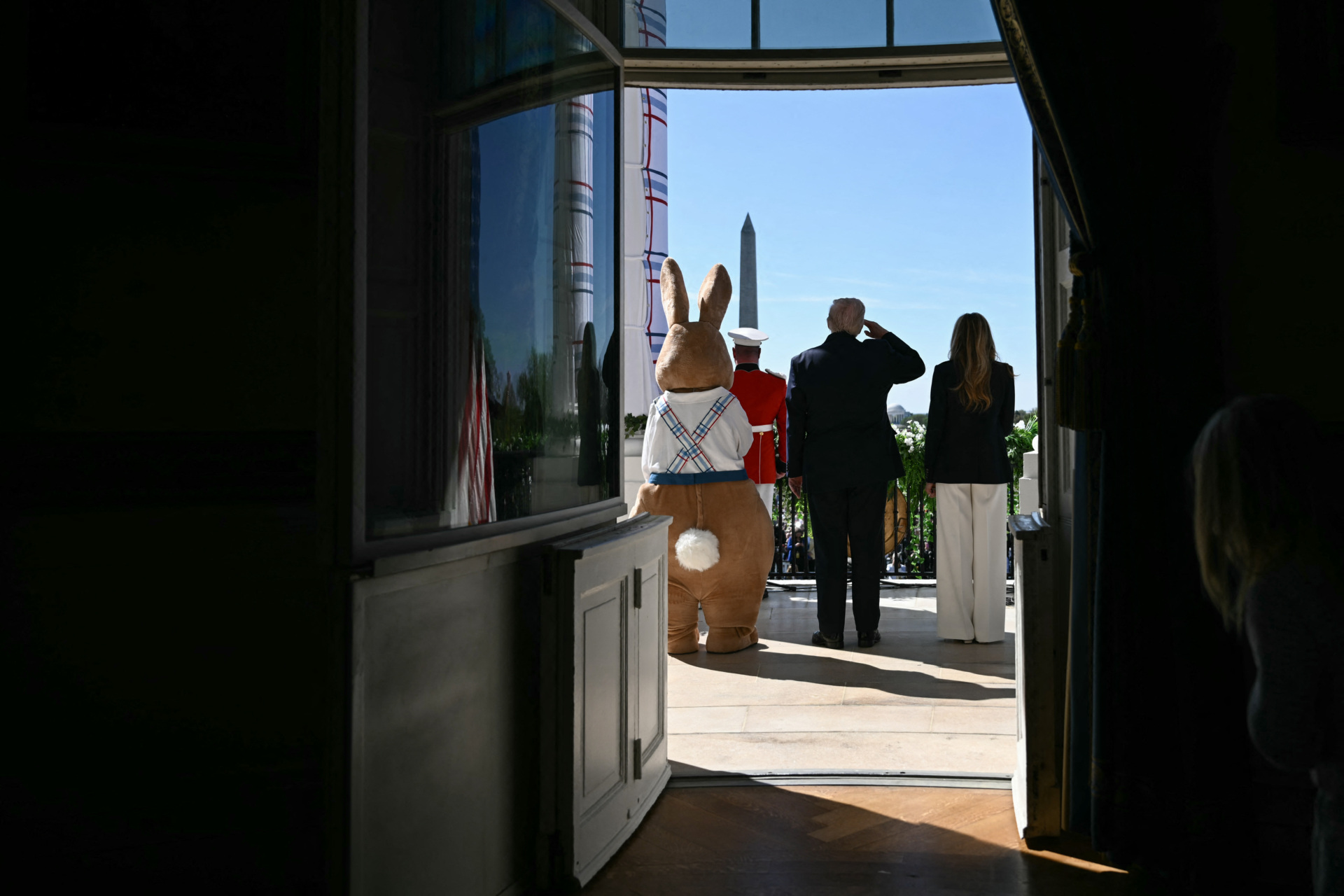 WASHINGTON, DC – APRIL 06: U.S. President Donald Trump and first lady Melania Trump arrive with the Easter Bunny on the balcony for the White House Easter Egg Roll on the South Lawn of the White House on April 06, 2026 in Washington, DC. The Easter Egg Roll is a White House tradition dating back to 1878. The Trumps also honored the 250th anniversary of the United States during the event. (Photo by Anna Moneymaker/Getty Images)