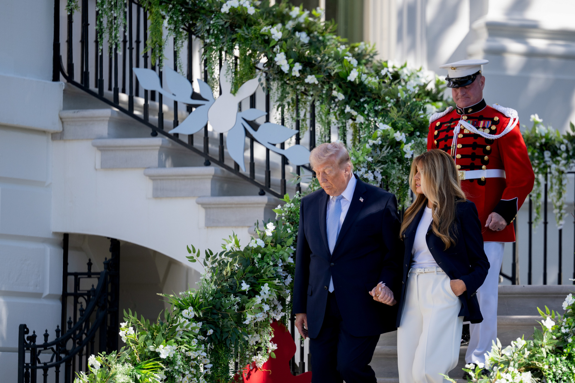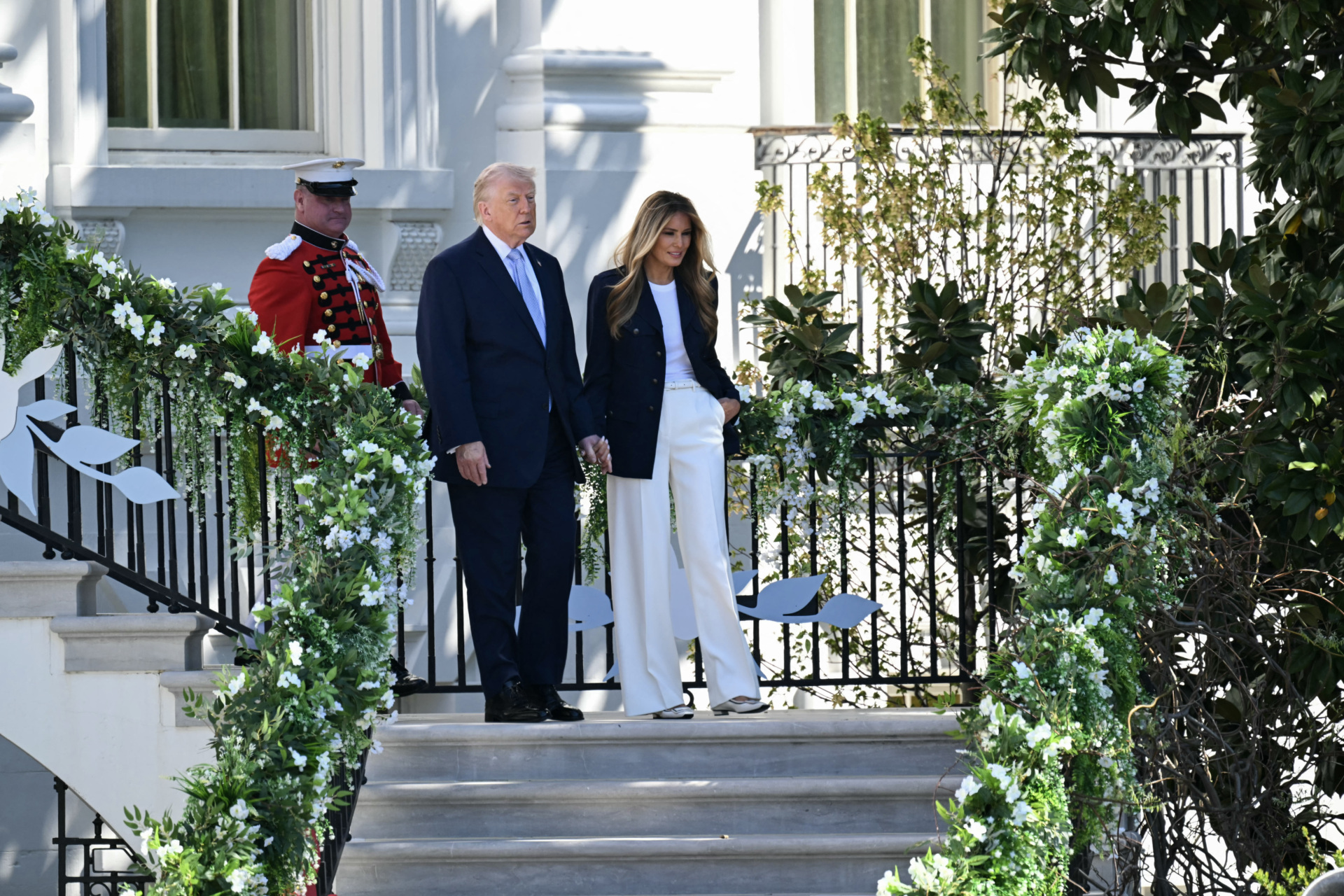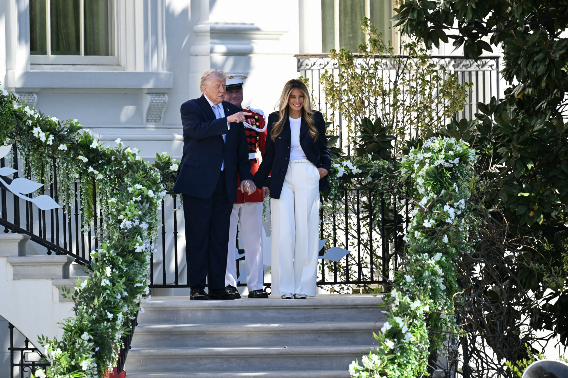 WASHINGTON, DC – APRIL 06: U.S. President Donald Trump, with First Lady Melania Trump, descends a staircase before greeting guests at the White House Easter Egg Roll on April 06, 2026 in Washington, DC. The Easter Egg Roll is a White House tradition dating back to 1878. The Trumps also honored the 250th anniversary of the United States during the event. (Photo by Anna Moneymaker/Getty Images)