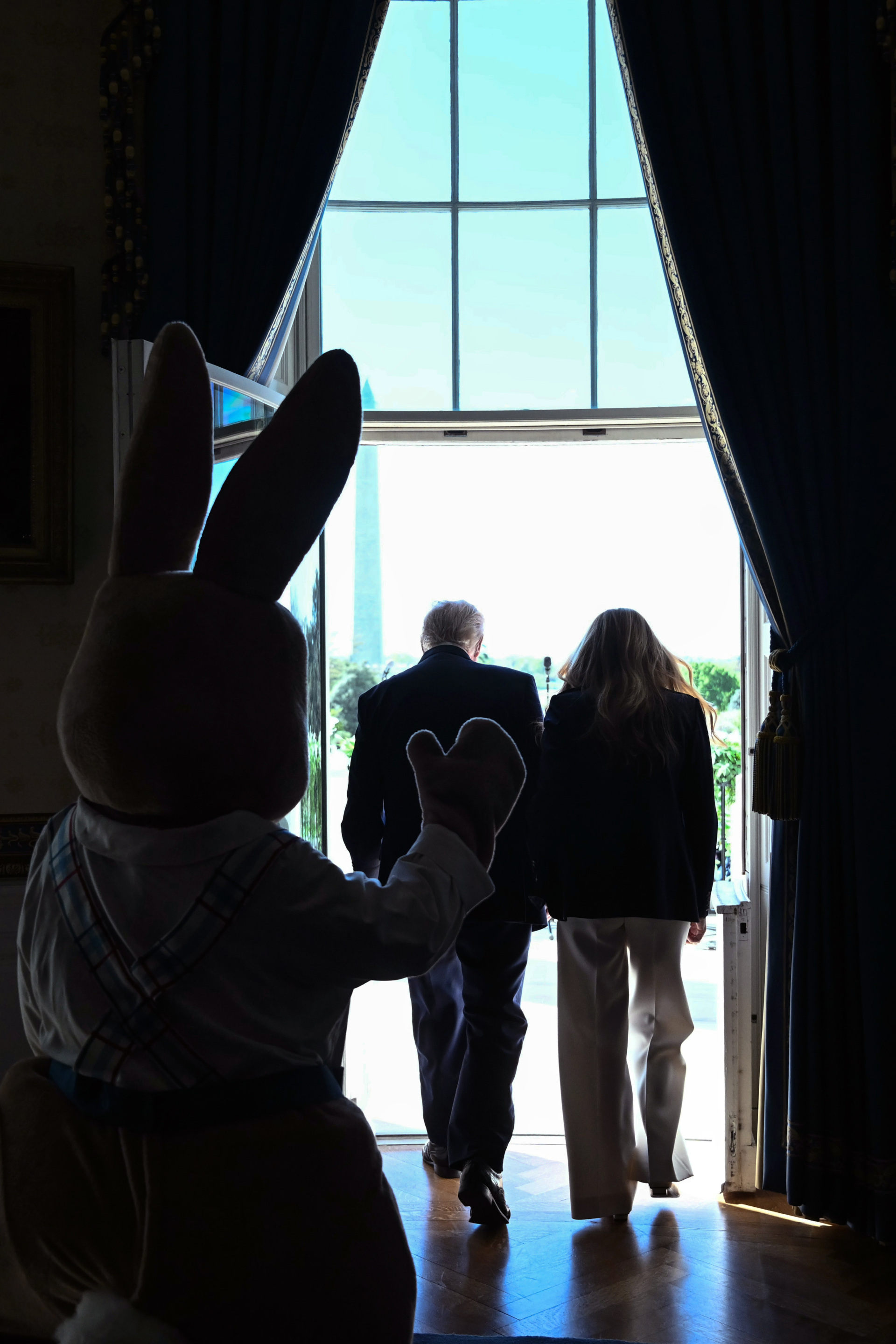 WASHINGTON, DC – APRIL 06: U.S. President Donald Trump and first lady Melania Trump arrive with the Easter Bunny on the balcony for the White House Easter Egg Roll on the South Lawn of the White House on April 06, 2026 in Washington, DC. The Easter Egg Roll is a White House tradition dating back to 1878. The Trumps also honored the 250th anniversary of the United States during the event. (Photo by Brendan Smialowski-Pool/Getty Images)