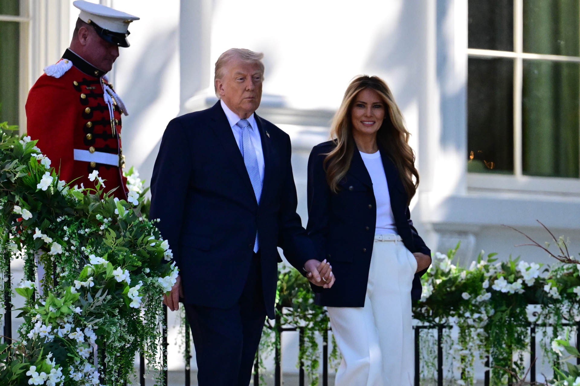US President Donald Trump and First Lady Melania Trump walks down the steps as they host the annual Easter Egg Roll on the South Lawn of the White House on April 6, 2026, in Washington, DC. (Photo by SAUL LOEB / AFP via Getty Images)