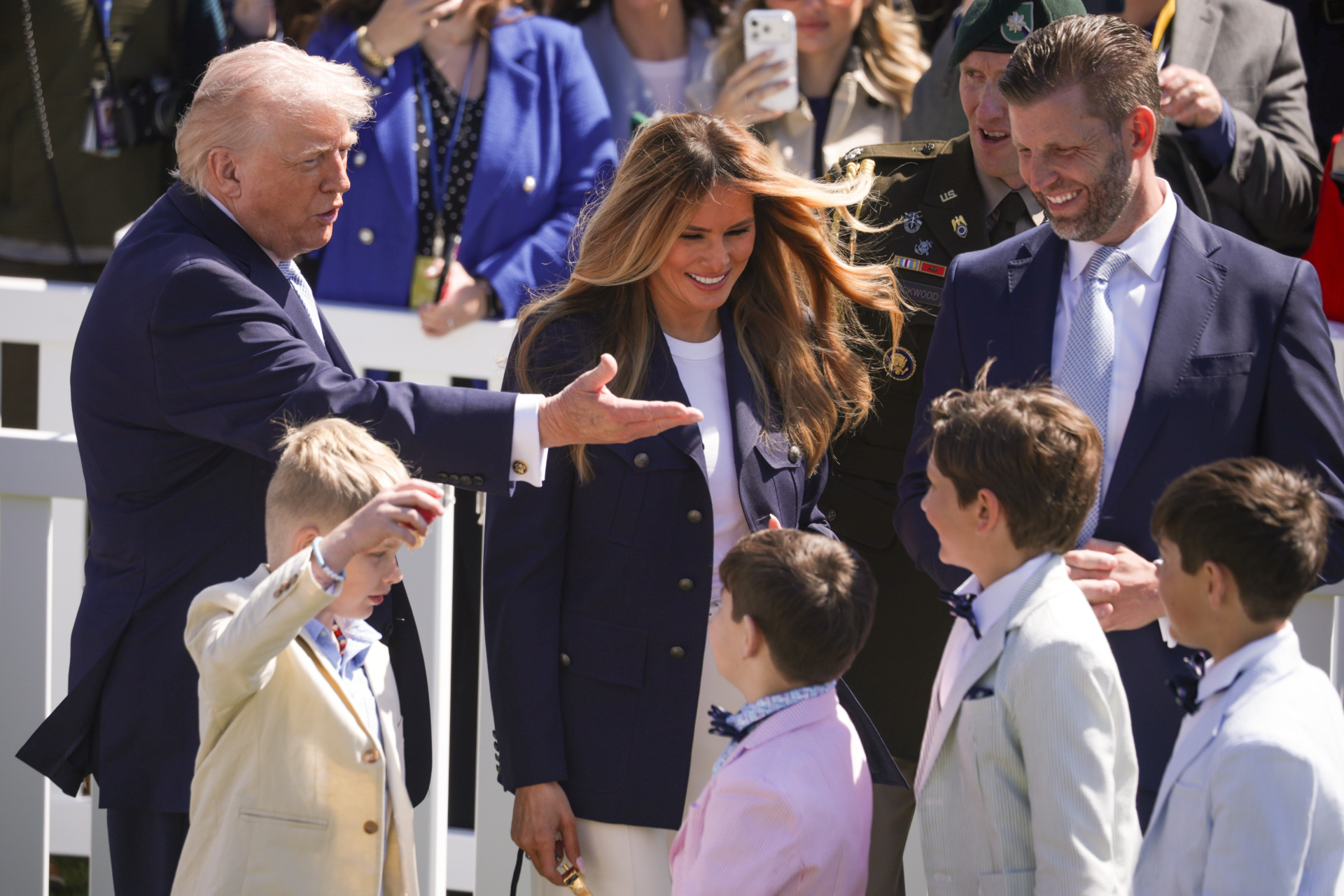 WASHINGTON, DC – APRIL 06: U.S. President Donald Trump, first lady Melania Trump, and Eric Trump attend the White House Easter Egg Roll on the South Lawn of the White House on April 06, 2026 in Washington, DC. The Easter Egg Roll is a White House tradition dating back to 1878. The Trumps also honored the 250th anniversary of the United States during the event. (Photo by Alex Wong/Getty Images)
