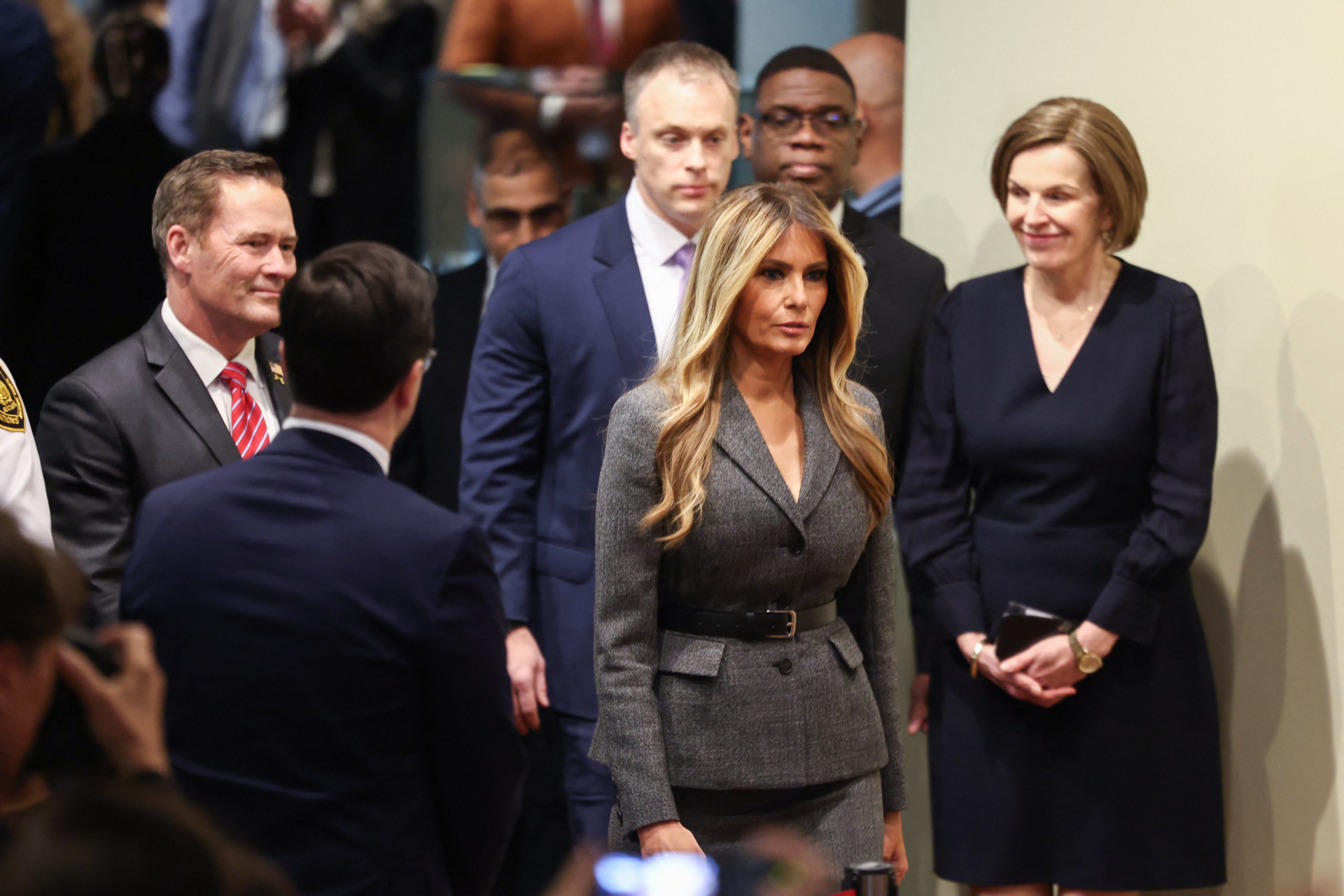 Melania Trump chose a gray textured wool bar jacket from Dior for the historic occasion, pairing it with a matching gray textured wool skirt, as well as a thin black leather belt from Dior and patent leather stilettos from Christian Louboutin.
