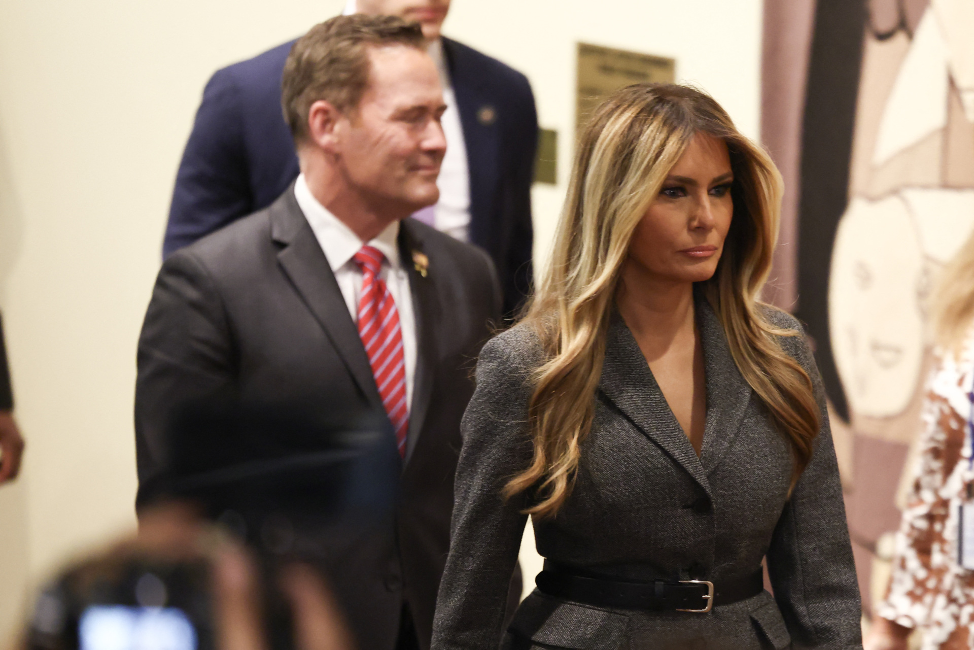 US First Lady Melania Trump arrives to chair a meeting of the United Nations Security Council at UN Headquarters in New York on March 2, 2026. First Lady Melania Trump is slated to chair a UN Security Council meeting on Monday, an appearance that was announced last week before the United States launched its war against Iran. (Photo by CHARLY TRIBALLEAU / AFP via Getty Images)