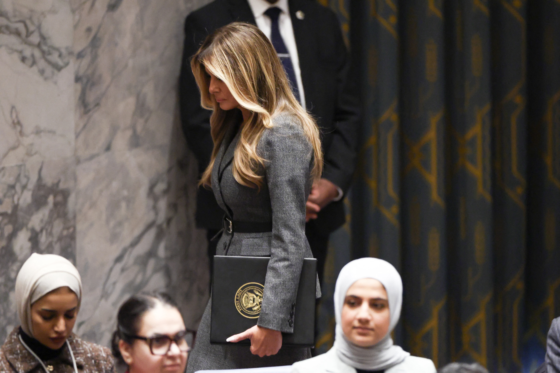 US First Lady Melania Trump walks to her seat to speak as she chairs a meeting of the United Nations Security Council at UN Headquarters in New York on March 2, 2026. (Photo by CHARLY TRIBALLEAU / AFP via Getty Images)