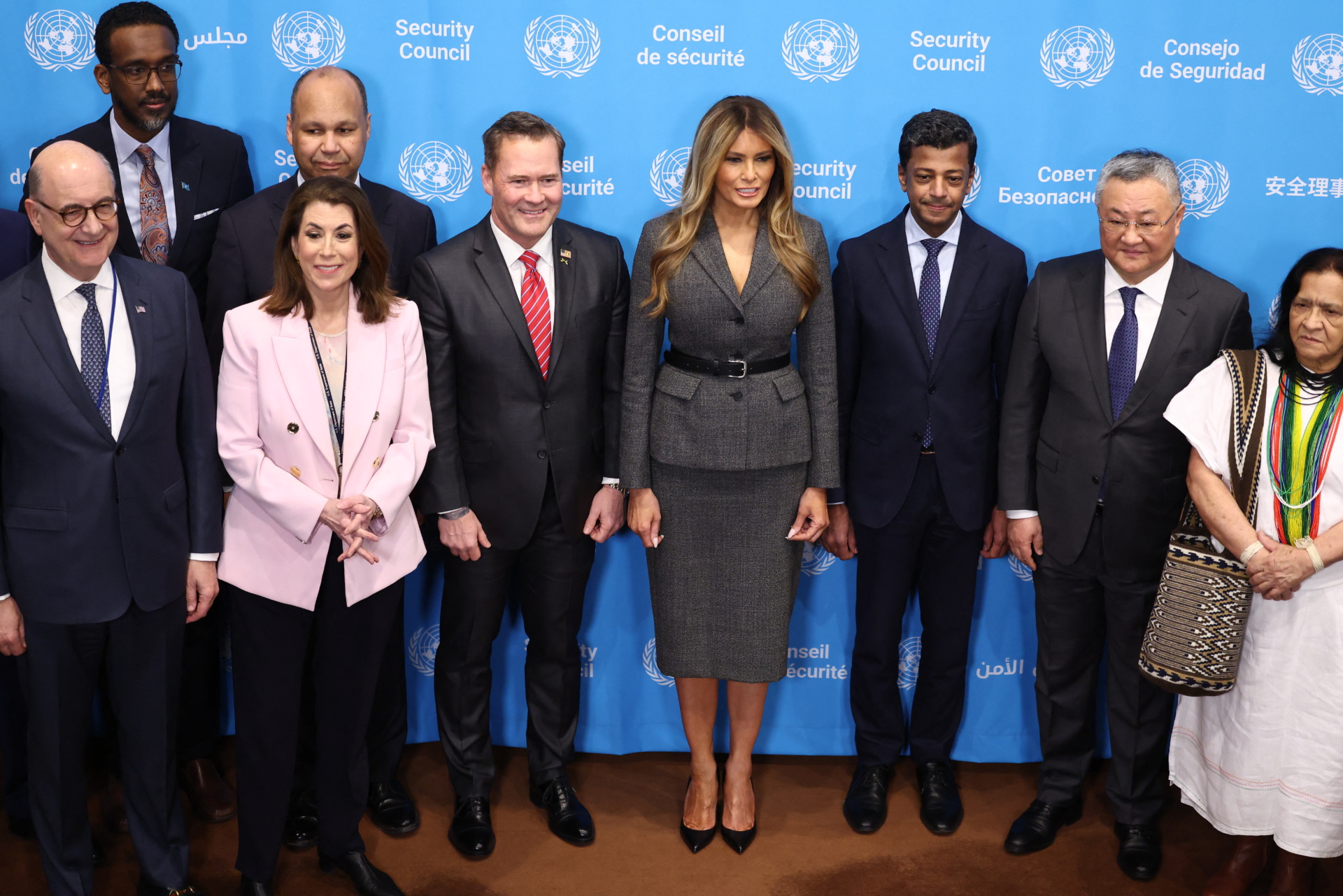 NEW YORK, NEW YORK – MARCH 02: First lady Melania Trump stands with ambassadors, including Mike Waltz (left) as she prepares to preside over Monday’s meeting of the United Nations (U.N.) Security Council on March 02, 2026 at UN Headquarters in New York City. Mrs. Trump will chair a U.N. panel on education’s role in “advancing tolerance and world peace.” She is the first First Lady to chair a meeting of the council. (Photo by Spencer Platt/Getty Images)