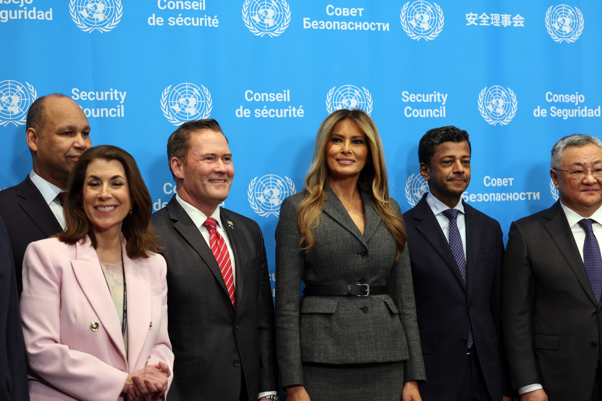 NEW YORK, NEW YORK – MARCH 02: First lady Melania Trump stands with ambassadors, including Mike Waltz (3rd L) as she prepares to preside over Monday’s meeting of the United Nations (U.N.) Security Council on March 02, 2026 at UN Headquarters in New York City. Mrs. Trump will chair a U.N. panel on education’s role in “advancing tolerance and world peace.” She is the first First Lady to chair a meeting of the council. (Photo by Spencer Platt/Getty Images)