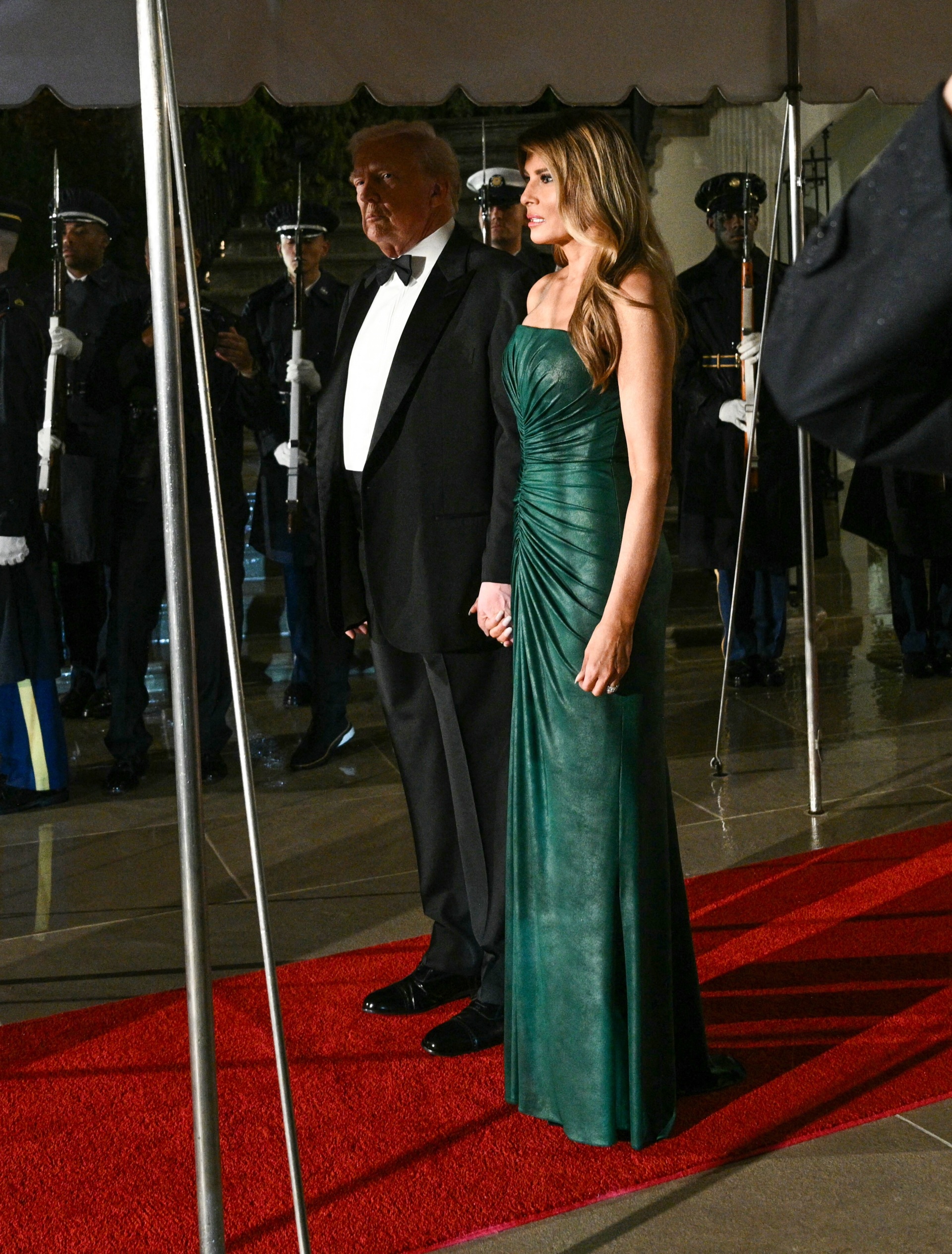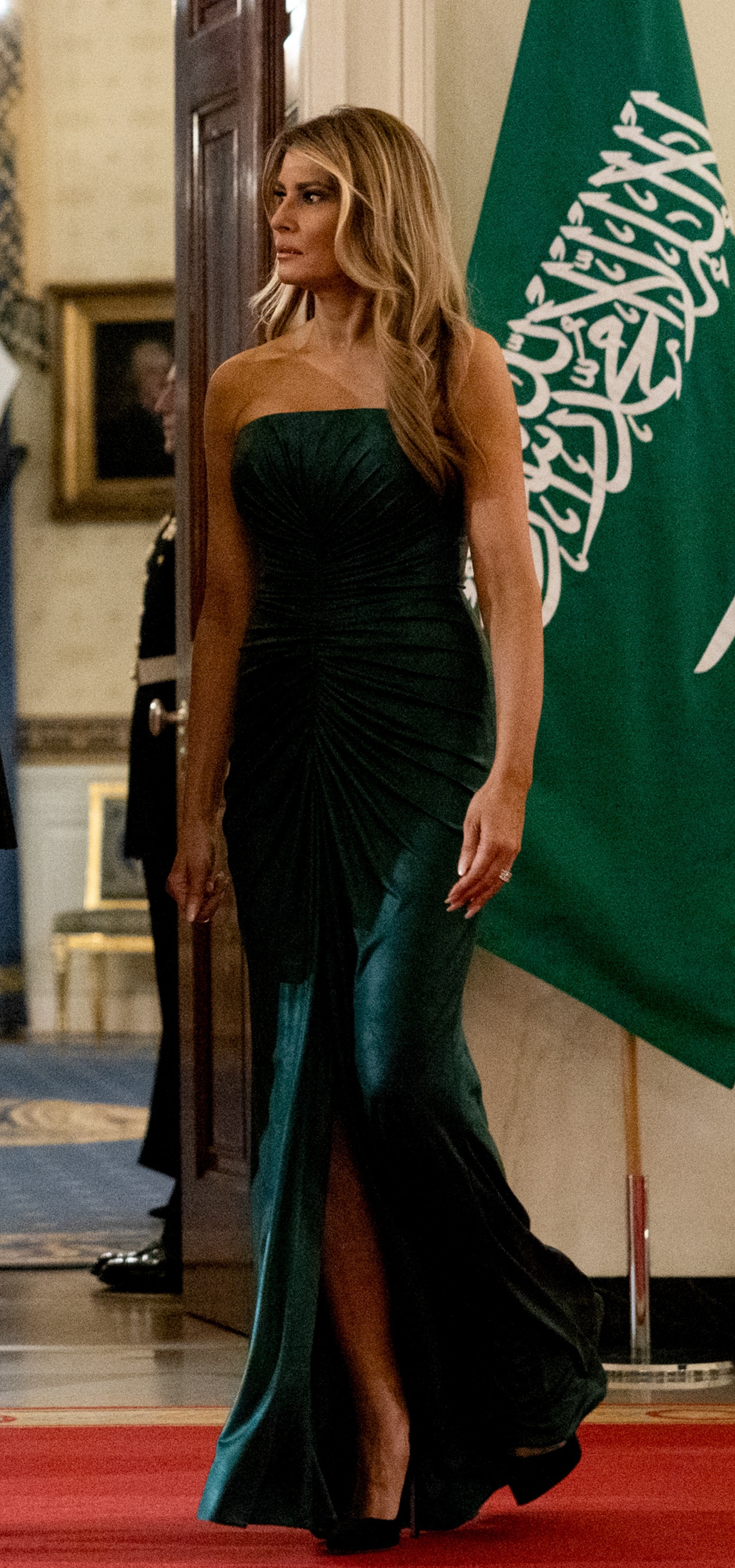 First Lady Melania Trump was elegantly mysterious in an emerald gown for a dinner in the East Room of the White House, where she and the president hosted the Crown Prince of Saudi Arabia.