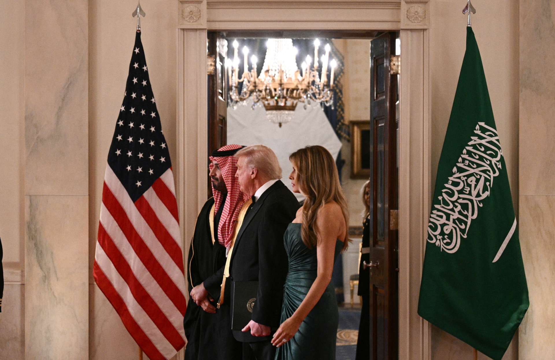 (L/R) Crown Prince and Prime Minister of the Kingdom of Saudi Arabia Mohammed bin Salman, US President Donald Trump and First Lady Melania Trump walk to the East Room of the White House for an official dinner in Washington, DC on November 18, 2025. (Photo by Brendan SMIALOWSKI / AFP) (Photo by BRENDAN SMIALOWSKI/AFP via Getty Images)