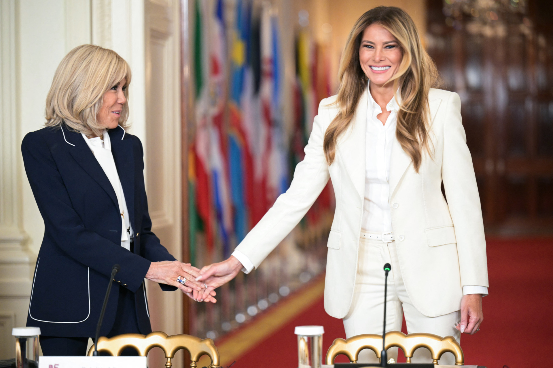 US First Lady Melania (R) greets French first lady Brigitte Macron (L) as she arrives for the Fostering the Future Together Global Coalition Summit in the East Room of the White House in Washington, DC, on March 25, 2026. (Photo by Oliver Contreras / AFP via Getty Images)