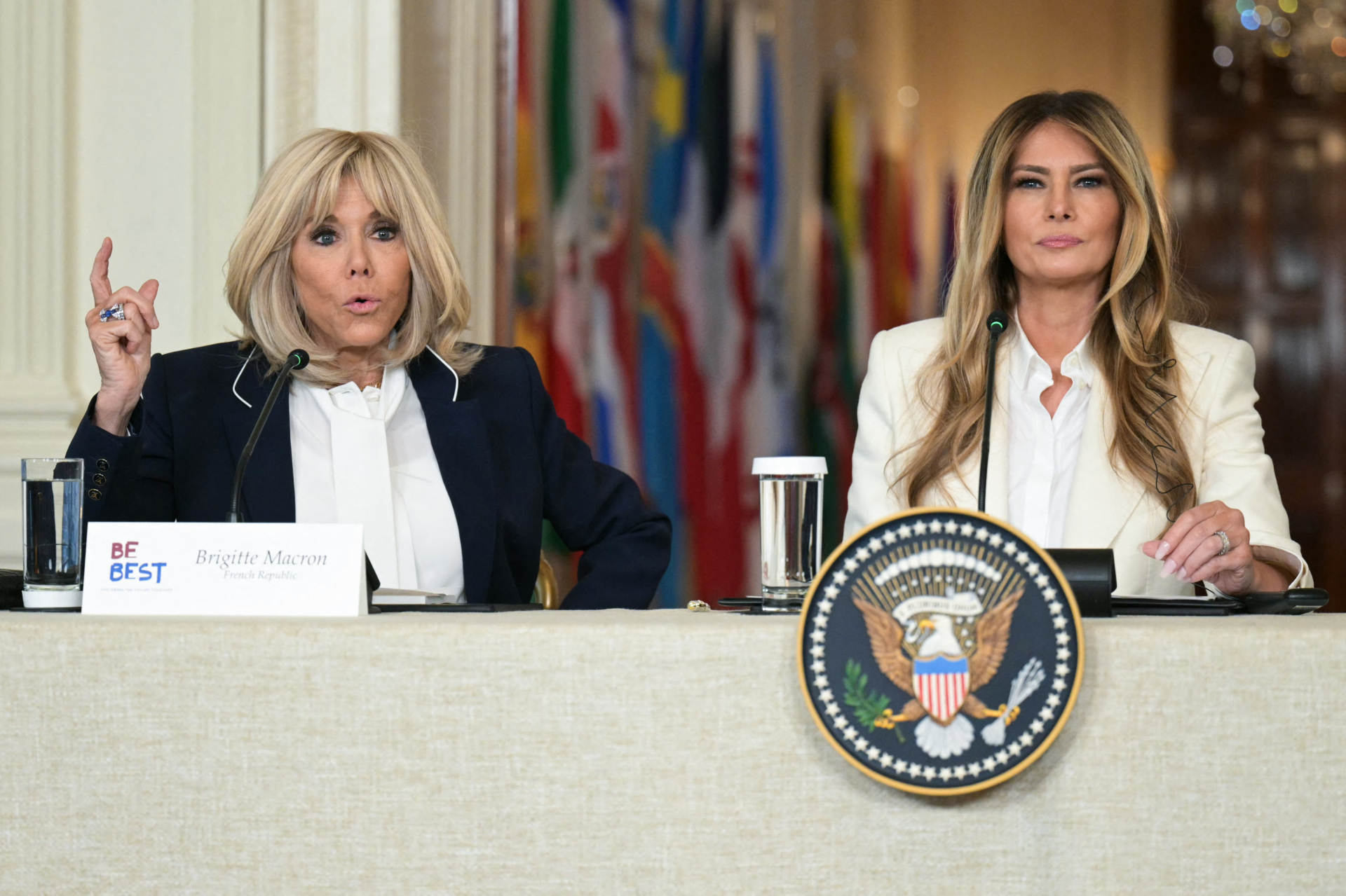 US First Lady Melania (R) listens as French first lady Brigitte Macron (L) speaks during the Fostering the Future Together Global Coalition Summit in the East Room of the White House in Washington, DC, on March 25, 2026. (Photo by Oliver Contreras / AFP via Getty Images)