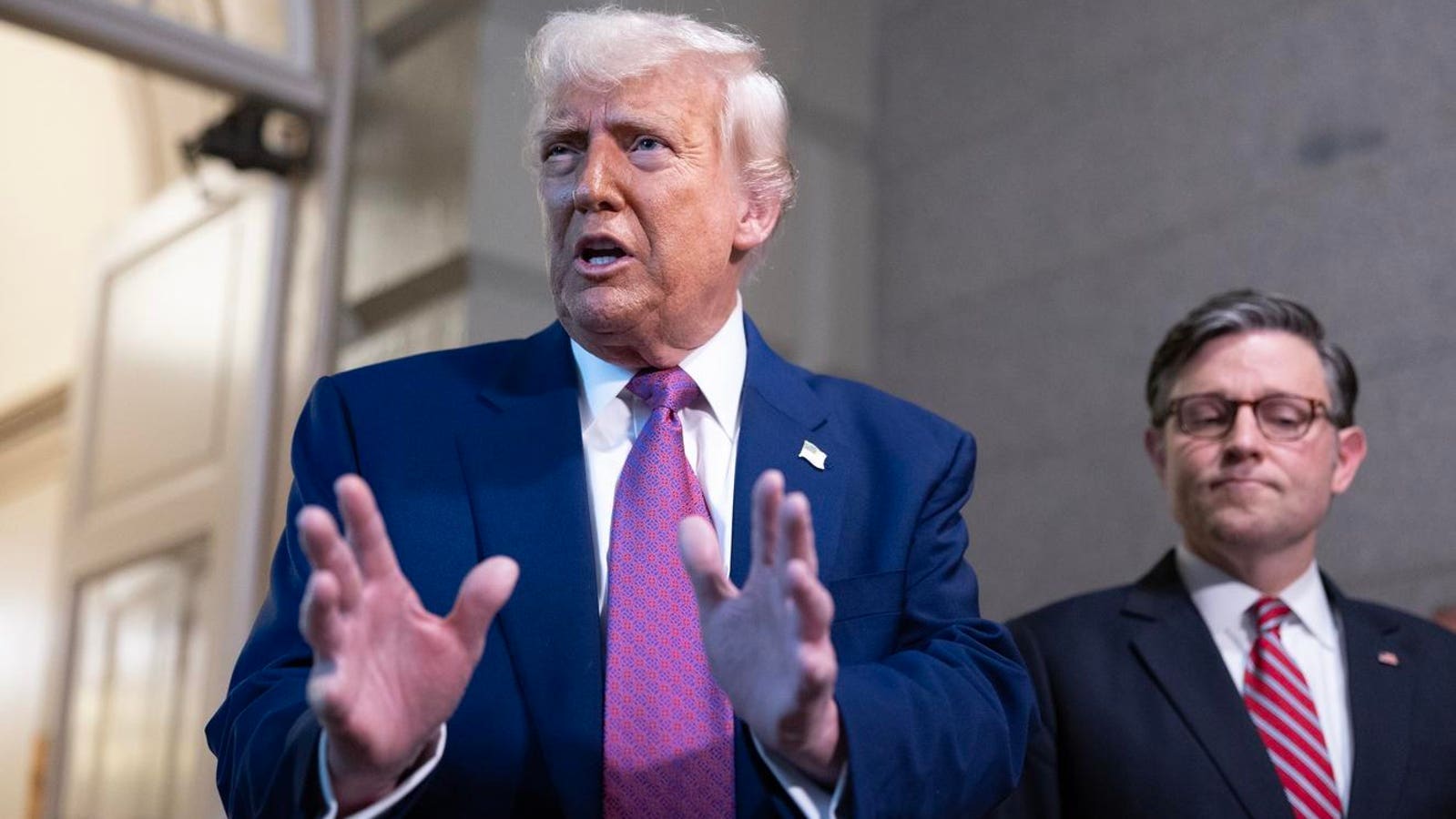 WASHINGTON, DC – MAY 20: President Donald Trump and House Speaker Mike Johnson (R-LA) speak to reporters following a closed-door meeting with House Republicans on May 20, 2025 on Capitol Hill in Washington. The Trump administration and House Republicans have taken steps to ramp up collections and payments for millions of federal student loan borrowers. (Photo by Tom Brenner For The Washington Post via Getty Images)