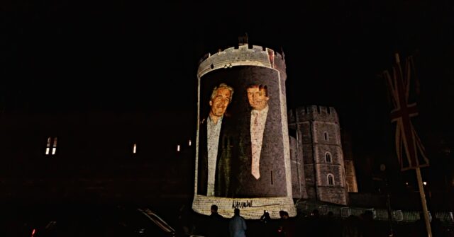 Images of Donald Trump and Jeffrey Epstein were projected onto Windsor Castle as U.S. President Trump’s second state visit to the UK begins on 16th September 2025 in Windsor, United Kingdom. (Mark Kerrison/In Pictures via Getty Images)
