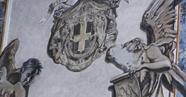 A fresco depicting an angel resembling Italian Prime Minister Giorgia Meloni holding a map of Italy visible in the Basilica of San Lorenzo in Lucina on February 2, 2026 in Rome, Italy. It has now been scrubbed out. (Simona Granati – Corbis/Corbis via Getty Images)