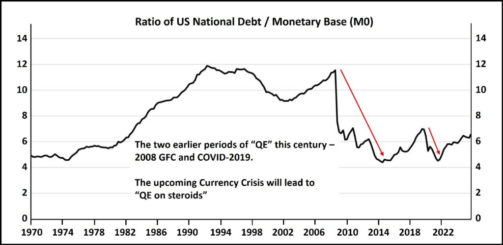 So, merely retesting the two immediate prior lows (at around 4) of the National debt-to-M0 ratio could send Gold’s target to $40,000 in the QE tsunami that is just ahead. A strong case can be made for why this 4 is a high number, given the bankrupt nature of US finances today, and that we should expect to see much lower levels in the years ahead. Even if the ratio doesn’t drop much below 4, the National debt itself is expected to witness a steep increase in the years ahead, leading to a significantly higher monetary base. But we will leave that argument for another day. $40,000/oz is good for now.