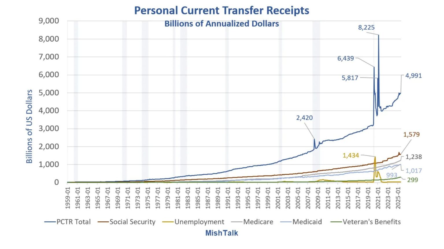 US consumers are increasingly dependent on Medicare, Medicaid, SNAP and Social Security.