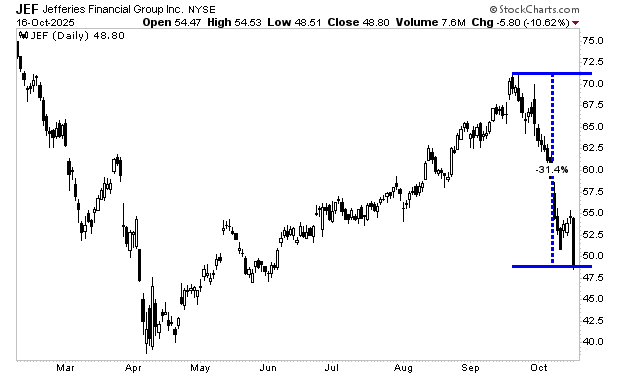 Jeffries Financial Group (JEF) has claimed that its exposure to FirstBrands is in the ballpark of $750 million via one of its investment funds. However, JEF shares are down 30% in roughly one month, suggesting things are in fact worse behind the scenes.
