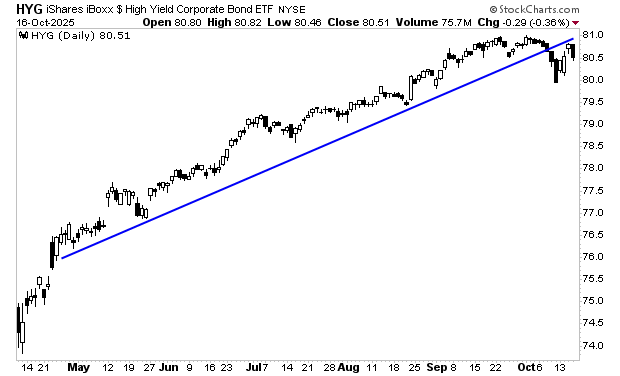 The issue is spreading throughout the credit markets. The high yield credit ETF (HYG) has taken out its bull market trendline. Even worse, it’s been rejected after a bounce, indicating that what used to be support is now resistance.