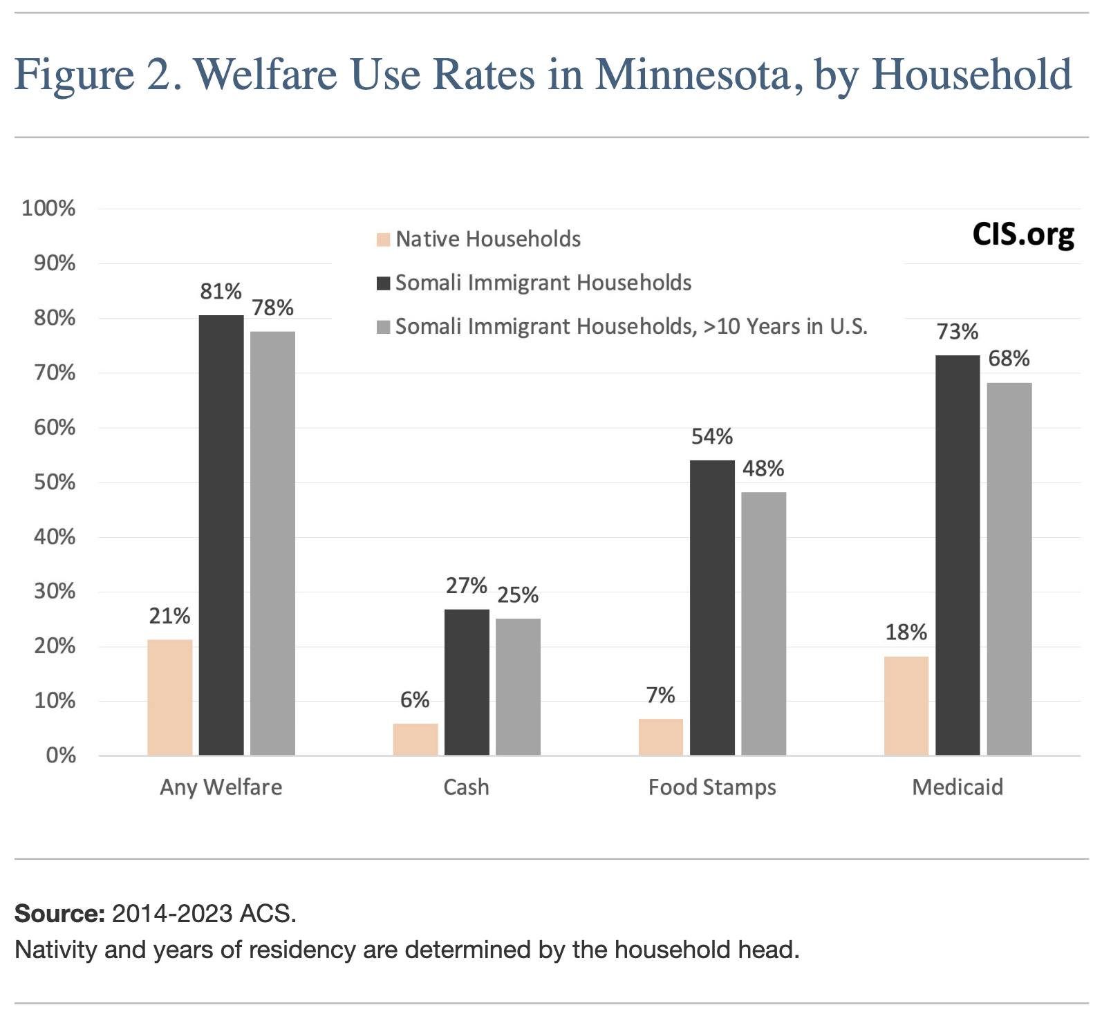 In particular, the data shows that 81 percent of Minnesota households headed by Somali refugees are on one or more forms of welfare, including 27 percent who are on cash welfare, 54 percent who are on food stamps, and 73 percent who are on Medicaid.