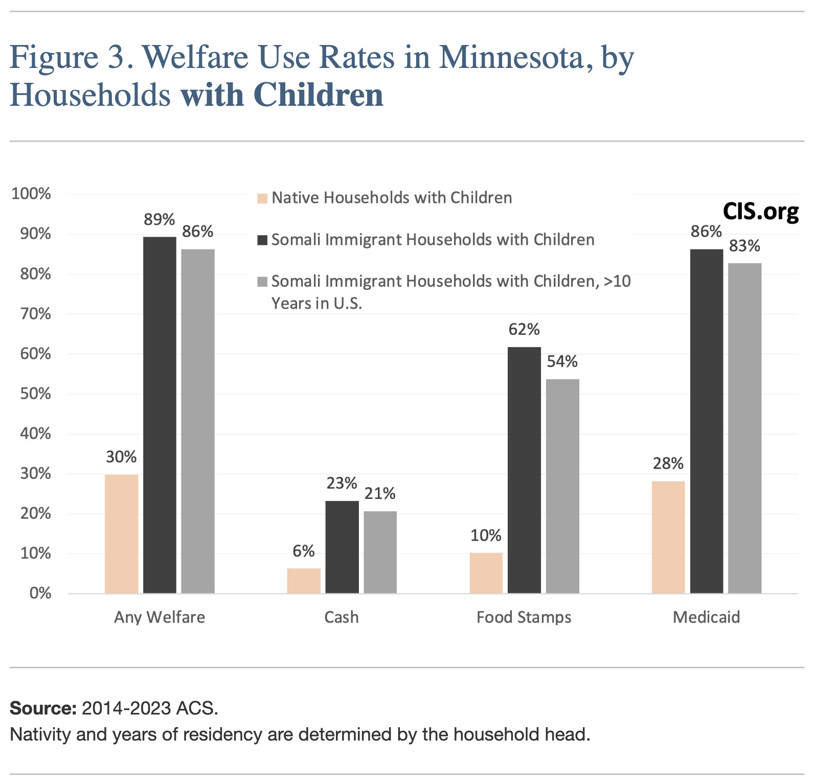 Welfare use goes even higher for Somali households where children are in the home, the ACS data finds.