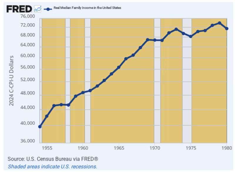 As it happened, the 1970s stagflation came on the heels of what had been an actual Golden Age by the standards of history between 1954 and 1969. During that period, real median family incomes rose from $39,700 to $66,870 or by a robust 3.53% per annum.
