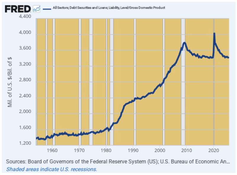 That does make a difference. The national leverage ratio during the 1970s averaged about 153% of GDP, meaning that had it been maintained since then total debt outstanding would now be $48 trillion. As it is, however, the actual leverage ratio currently stands at 342% of GDP and outstanding debt totals nearly $108 trillion.