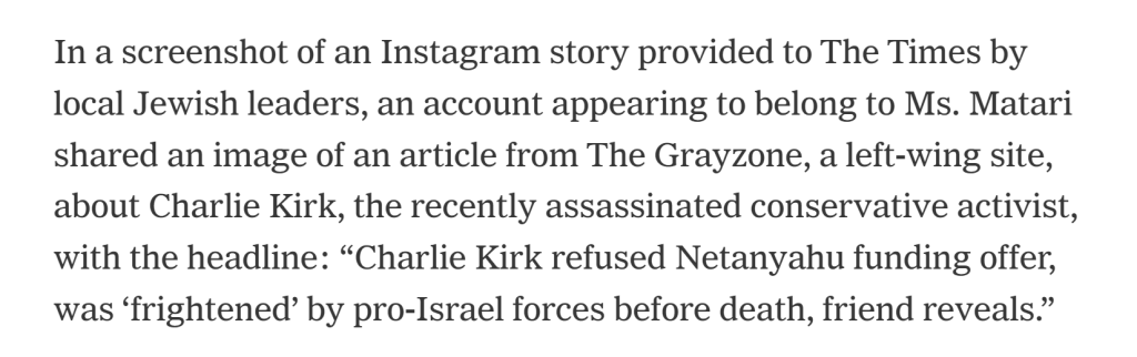 In justifying the cancellation, the Times relied heavily on baseless accusations from those pro-Israel factions. Among the complaints reported by the Times was that Matari reposted the headline of The Grayzone’s recent article, “Charlie Kirk refused Netanyahu funding offer, was ‘frightened’ by pro-Israel forces before death, friend reveals.” The Times described the article as one which “members of the Jewish community” regarded as “hateful, divisive and antisemitic.”