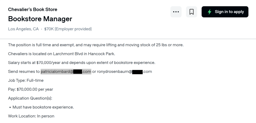 As she explained to The Grayzone, the Times never disclosed that the publisher of the Larchmont Buzz is also a hiring manager at Chevalier’s Books, which cancelled her event. The email address of that woman, Patricia Lombard, is listed as one of two suggested recipients in a recent posting on Glassdoor soliciting applicants for a Bookstore Manager position at Chevalier’s. According to Matari, protesters relayed to her that Lombard attended the demonstration undercover and feigned solidarity with its participants. She was “sitting or standing outside talking to people and asking questions, pretending to seem like she was there in support,”