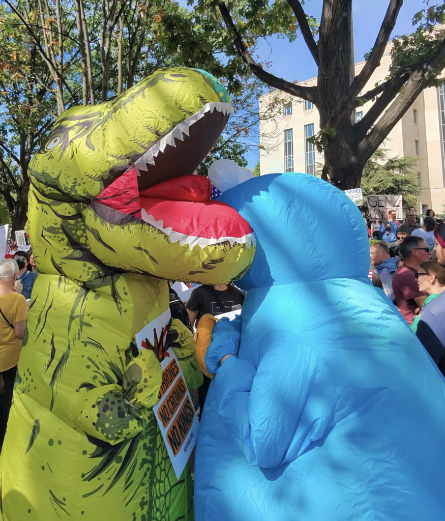 The use of inflatable animal costumes is a recent trend with activists which started as a response to the Trump administration going after violent leftists, with the intention to counter the narrative of violent riots by trying to appear as harmless as possible. Of course, as is the case with most strategies leftist activists employ, it just ends up making them look bizarre and creepy, and the violent rhetoric seems to survive on signs without opposition despite the organizers’ spoken intentions.