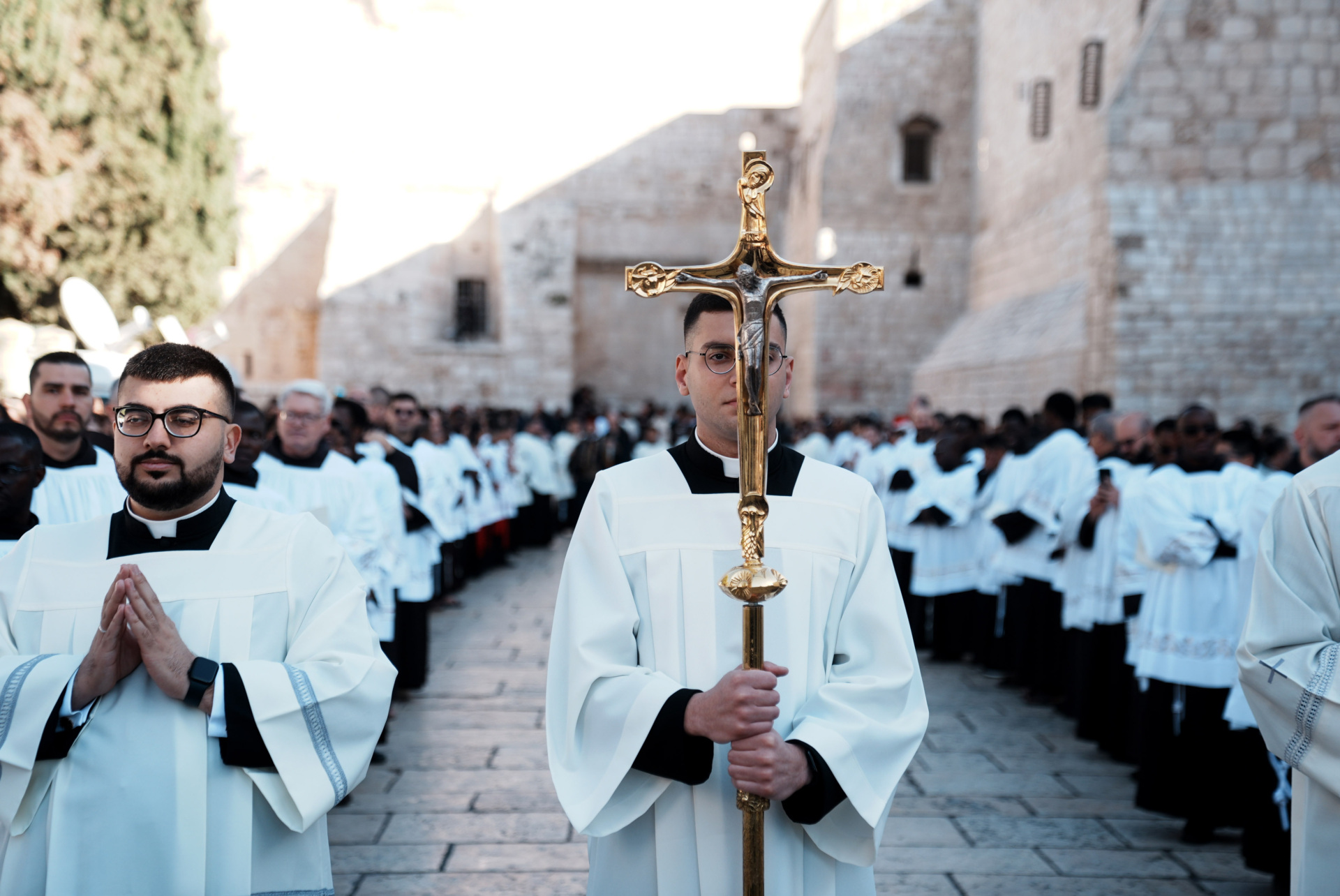 Catholic clergy take part in the annual Christmas procession led by the Latin Patriarch of Jerusalem Cardinal Pierbattista Pizzaballa outside the Church of the Nativity, where Jesus was born, in the West Bank city of Bethlehem on December 24, 2025. Scouts marched under a clear blue sky in Bethlehem on December 24, 2025, as the Palestinian city emerged from the shadow of the war in Gaza to celebrate its first festive Christmas in more than two years. (ilia yefimovich / AFP via Getty Images)