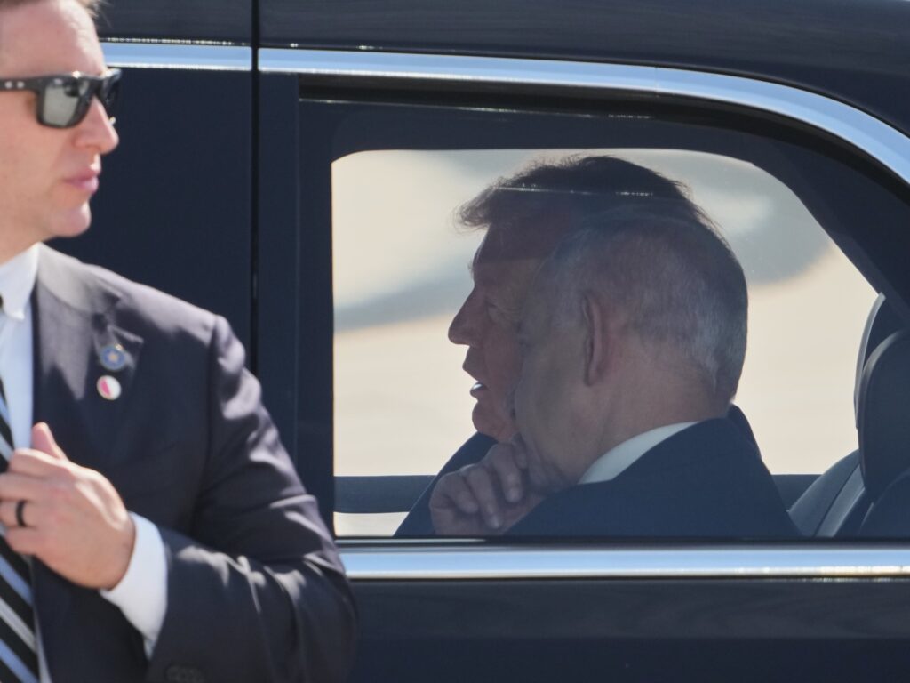 President Donald Trump speaks with Israeli Prime Minister Benjamin Netanyahu as they sit together in a car after a welcoming ceremony at Ben Gurion Airport near Tel Aviv, Israel, Monday, Oct. 13, 2025. (AP Photo/Ariel Schalit)