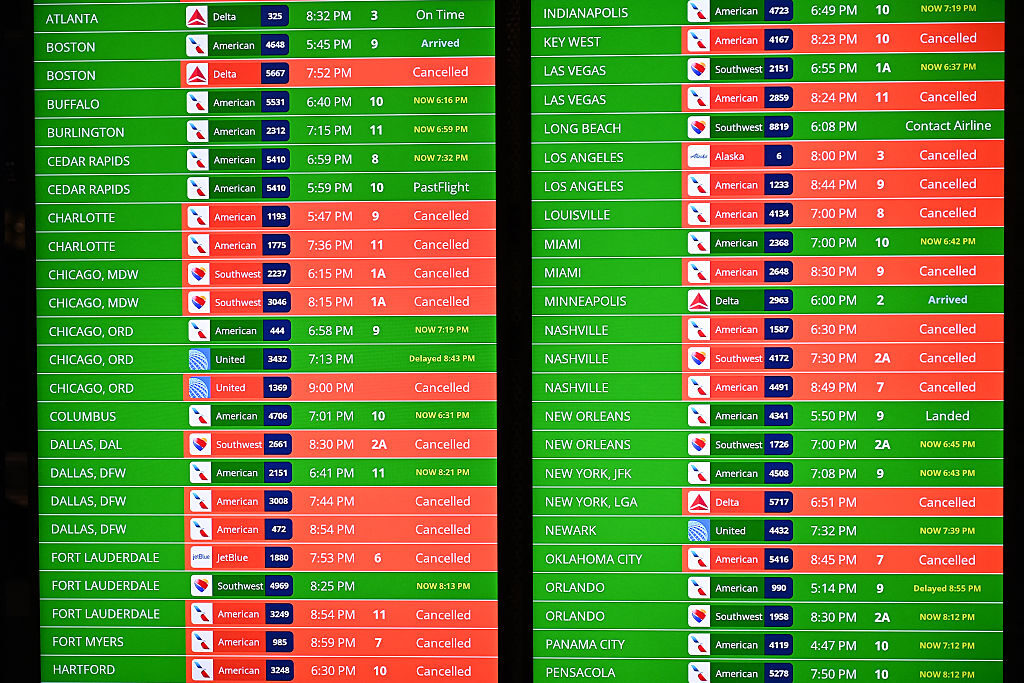 Cancelled flights show at Ronald Reagan National Airport in Washington, DC, on January 24, 2026. A massive winter storm has dumped snow and freezing rain on New Mexico and Texas as it swept across the U.S. towards the northeast, threatening tens of millions of Americans with blackouts, transportation chaos and bone-chilling cold. (Alex WROBLEWSKI / AFP via Getty Images)