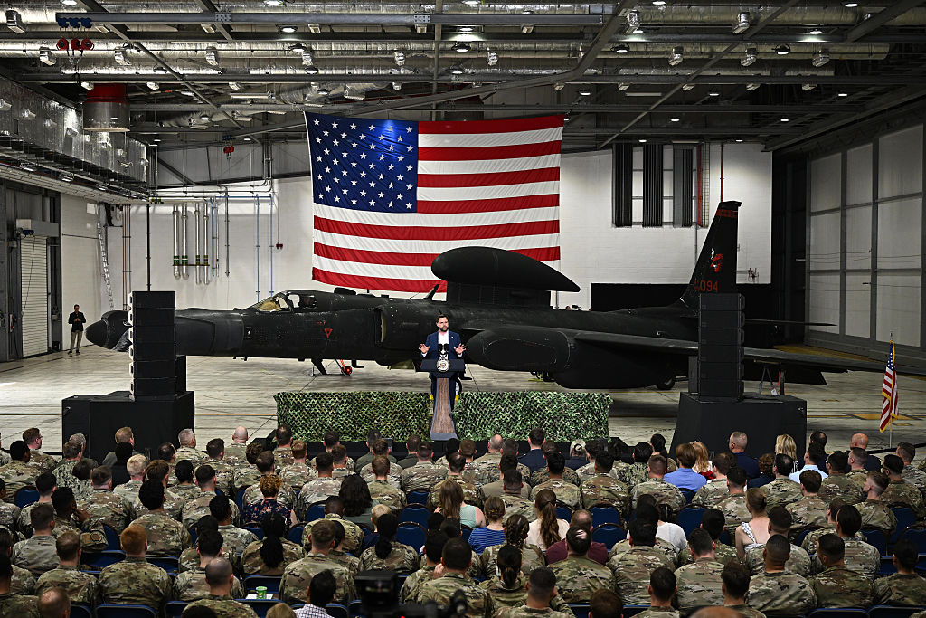 FAIRFORD, ENGLAND – AUGUST 13: U.S. Vice President JD Vance addresses U.S. troops and their families in front of a Lockheed U-2 nicknamed the “Dragon Lady”, during a visit to RAF Fairford on August 13, 2025 in Fairford, England. U.S. Vice President JD Vance is making the visit to American troops from the United States Air Force’s 501st Combat Support Wing and the 99th Expeditionary Reconnaissance Squadron based at RAF Fairford. The visit comes as Vance and his family are spending part of their summer vacation in nearby Chipping Norton in the Cotswolds. (Photo by Leon Neal/Getty Images)