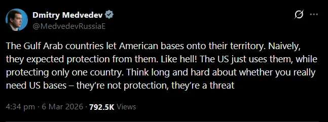 US bases across the Gulf – Bahrain, Qatar, Kuwait, the UAE – were always sold as the physical expression of the guarantee. The muscle that backed the paper. They were protection. Except now those bases are targets. The countries hosting them are getting hit precisely because they host them. What once was “US military presence as shield” has collapsed and became “US military presence as a bullseye”.