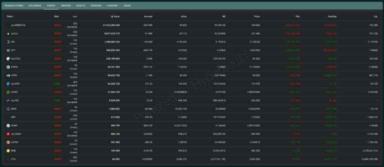 Our own capture of the wallet’s Hypurrscan perps page confirms the scale in one snapshot. It shows a short of roughly 200,000 BRENTOIL contracts valued above 21.6 million dollars and a crude short of about 91,900 CL contracts worth almost 9.9 million dollars, alongside large shorts in HYPE, PUMP, APT, ASTER and other tokens. This is not a small retail trader misclicking on a phone. It is a concentrated macro bet that oil will crash once the panic burns out.