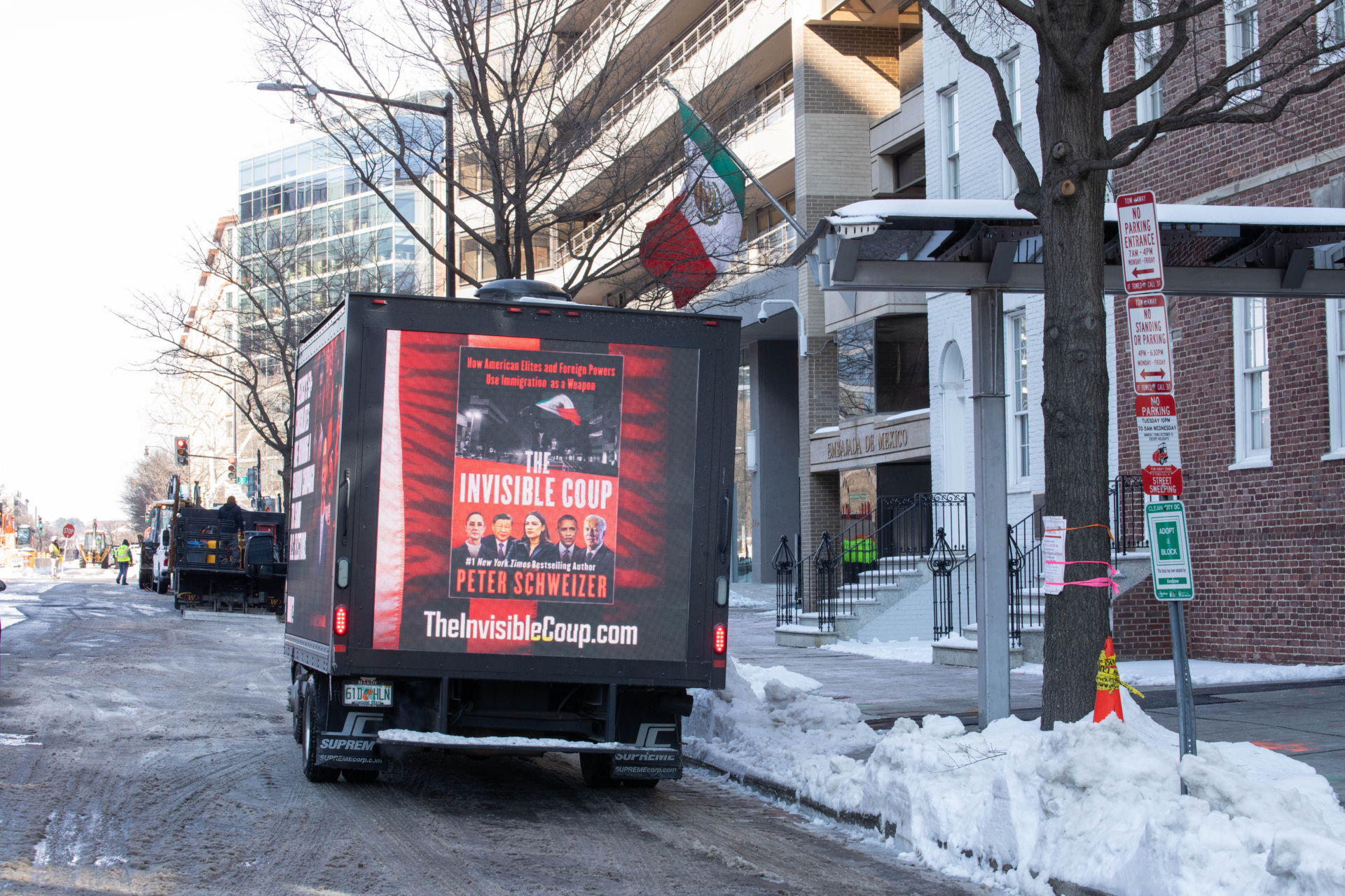 A billboard truck displaying information about Peter Schweizer’s bestselling book “The Invisible Coup” is seen in Washington, DC, outside the Mexican embassy. (Photo courtesy of GAI)