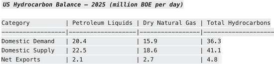 Accordingly, as shown below the USA in 2025 produced 41.1 million BOE/day of combined oil and gas, which well exceeded domestic demand of 36.3 million BOE/day. The latter went into the slate of refinery products sold domestically and the pipeline delivery of nat gas to domestic end markets.