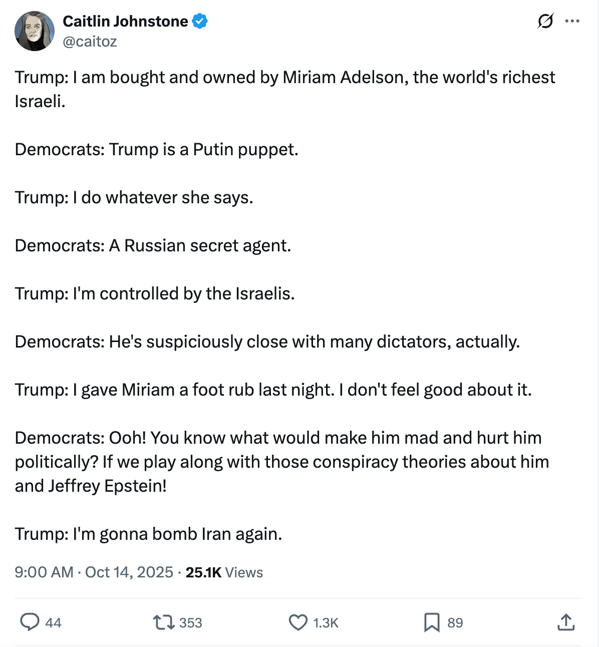 But here’s Trump openly admitting to bending over backwards to give an Israeli oligarch whatever she wants because she gave his campaign huge sums of money, while pouring weapons into Israel to facilitate its mass atrocities and engaging in acts of war on Israel’s behalf. And it barely makes a blip in mainstream western politics or media.