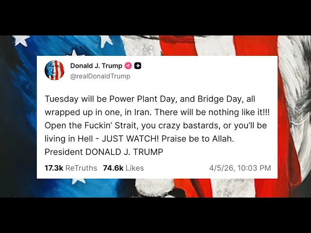 The president of the United States has a bat shit crazy post on Truth Social once again threatening to blow up civilian infrastructure in Iran, saying, “Tuesday will be Power Plant Day, and Bridge Day, all wrapped up in one, in Iran. There will be nothing like it!!! Open the Fuckin’ Strait, you crazy bastards, or you’ll be living in Hell — JUST WATCH! Praise be to Allah. President DONALD J. TRUMP.”