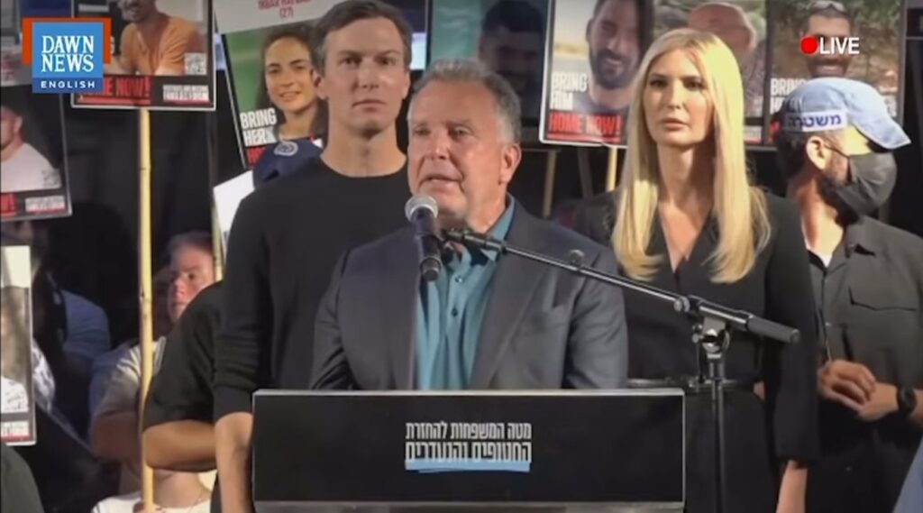 Witkoff and Kushner drew cheers from the attendees. As he prepared to speak, an adoring crowd waving Israeli and American flags chanted: “Thank you, Witkoff.”