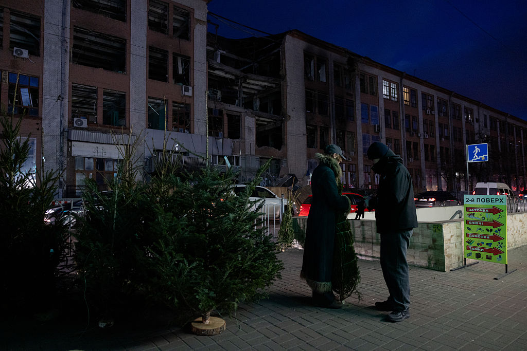 A woman holds a Fir Tree better known as a Christmas tree at a street market near damaged buildings in Kyiv on Christmas Eve celebrations on December 24, 2025, amid the Russian invasion of Ukraine. (Photo by Tetiana DZHAFAROVA / AFP via Getty Images)