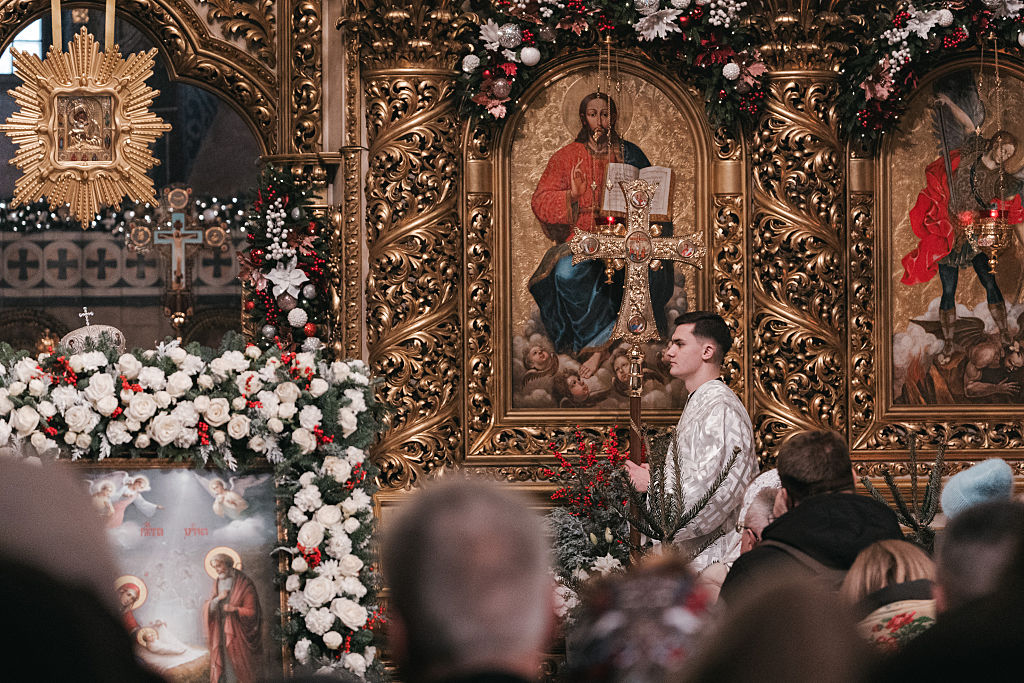 A subdeacon carries a golden cross in front of the altar during the Christmas Divine Liturgy at St. Michael’s Golden-Domed Monastery in Kyiv, Ukraine (Photo by Daniel Yovkov / Hans Lucas / AFP via Getty Images)